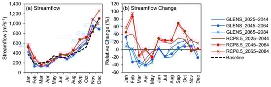 Climatology (a) and relative changes (b) of the streamflow at the Jambatan Guillermard between the historical (1985–2004) and future periods (2025–2044, 2045–2064 and 2065–2084) under RCP8.5 and GLENS.