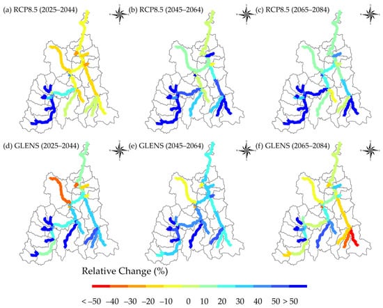 Relative changes of maximum daily flow at the sub-basin level in the KRB for GLENS and RCP8.5 during the 2025–2044, 2045–2064 and 2065–2084 periods as compared to the 1985–2004 baseline period.