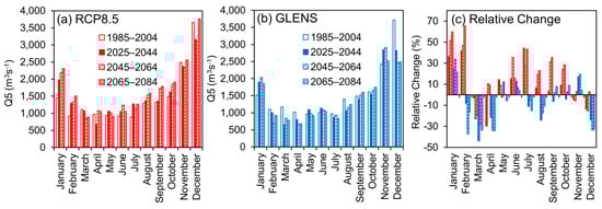 High flow (Q5) at the Jambatan Guillermard station under (a) RCP8.5 and (b) GLENS and (c) the relative changes of the 2025–2044, 2045–2064 and 2065–2084 periods from the 1985–2004 baseline period.