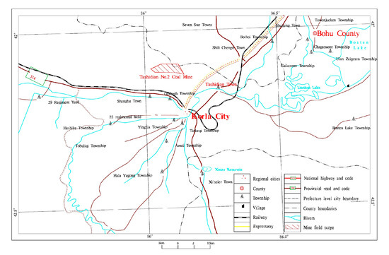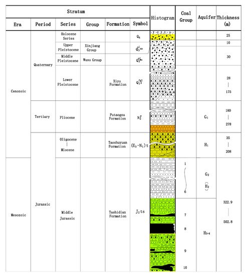Mining seas are located at the weak-water-abundance aquifer (H3) on the bearing fractures of the middle Jurassic Tashidian formation. As shown in Figure 2 (see Figure S1 in Supplementary Material), four aquifers and aquicludes were above the mining coal seam, which was the Quaternary permeable stratum. The aquiclude was of clayey mudstone and siltstone in the Putaogou formation of the Neogene Pliocene series. The weak-water-abundant aquifer on the bearing fractures of Oligocene-Miocene Taoshuyuan Formation in the Paleogene series and the aquiclude consist of paleo crust of weathering mudstone, siltstone, and fine sandstone.