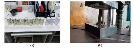 Tests performed on the samples: (a) view of the test samples, a group of three test samples from left to right are siltstone, mudstone, medium sandstone and sandy conglomerate; (b) uniaxial compressive strength measurement on the prepared test samples.