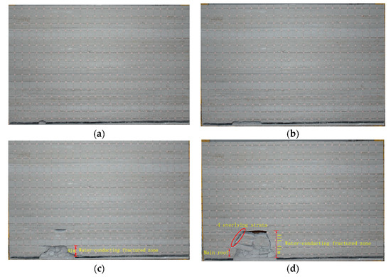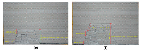 The mudstone false roof with a thickness of 3 m existed above the No. 8 coal seam in the W8203 working face. According to the experimental results, the water-conducting fractured zone began to develop with the forward advance. As the working face moved forward to 0~120 m, the height of the water-conducting fracture zone was maintained at 3 m, as shown in Figure 8a,b.