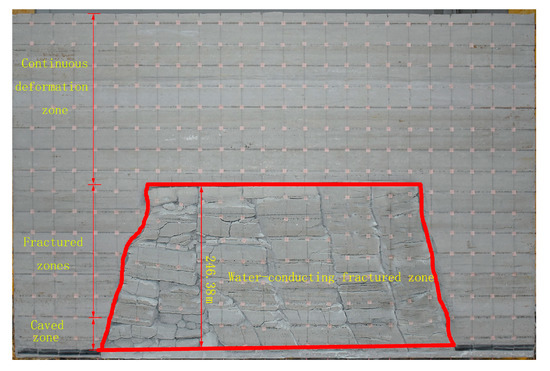 As the working face moved to 510 m and mining was completed, we observed the gravel stratum with a thickness of 96.85 m after the overlying stratum was fully stable. No apparent fractures and cracks noticeably occurred in the gravel stratum. The water-conducting fracture zone stopped the development and maintained its height at 246.28 m—a significant “八”-shaped longitudinal fracture formed from the left side’s open-off cut extending to the right’s mining stop. As shown in Figure 9, the caving strata on the top of the goaf showed saddle-shaped distribution. According to the theory of the upper three zones, it developed the caved zone, the fractured zone, and the continuous deformation zone in the overlying strata of the W8203 working face. Based on the measured results in Tashidian Erjingtian Mine, the height of the water-conducting fracture zone on the roof of the No. 8 coal seam was 229.32 m. The measured value was close to the simulation data with the physical analog model, suggesting the reliability of the present physical analog model tests.