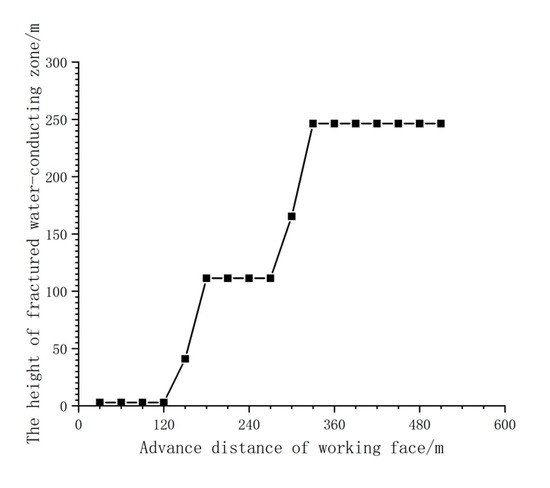 Based on the judgment results of the locations of key strata in the working face, the mudstone false roof with a thickness of 3 m was determined as the sub-key stratum 1. The sub-key stratum 2 was above the sub-key stratum 1; therefore, the latter had no controlled stratum, which fell with mining during the advancing process. Therefore, a water-conducting fracture zone immediately developed when the W8203 working face began to move forward. At an advancing range of 0~120 m, the height of the water-conducting fracture zone was 3 m. As the operational front of the working face moved to 150 m, the sub-key strata 2 was first fractured, and the height of the water-conducting fracture zone changed abruptly and briefly stayed at 41 m. As the working face moved to 180 m, four strata controlled by the sub-key stratum underwent the first fracture, and the height of the water-conducting fracture zone developed upwards to the bottom of the sub-key stratum 3 and reached up to 111.41 m. Afterward, as the working face moved to 180~279 m since the sub-key stratum showed no fracturing, the development of water-conducting fractures was stagnant. As the working face moved to 300 m, the suspended span below the sub-key stratum 3 reached the limit of caving fracturing distance. At that moment, the sub-key stratum 3 was fractured first, and the height of the water-conducting fracture zone changed abruptly and briefly stayed at 165.38 m. As the working face moved to 330 m, two overlying strata controlled by the sub-key stratum 3 fractured first, the water-conducting fractured zone developed upwards, and the water-conducting fracture height changed abruptly to the bottom of the primary key stratum, reaching up to 246.38 m. As the working face moved from 330 to 510 m (the terminal mining line), the primary key strata were not fractured, and the development of water-conducting fractures tended to be stable and showed no change. Finally, the height of the water-conducting fracture zone was maintained at 246.38 m.