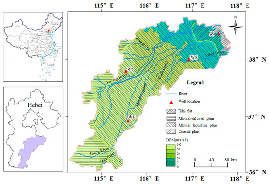 The Heilonggang region covers an area of 34,700 km2. The terrain in this region is gentle and inclines slightly from southwest to northeast with a topographic slope of 0.2~0.1‰. From west to east, the geomorphic type is dominated by the mountain alluvial-diluvial plain, the central alluvial-lacustrine plain and the coastal plain, respectively. Accordingly, from west to east, sediments change from gravel in front of the mountain, to medium coarse and medium fine sand in the middle, then to fine sand in the coastal area.