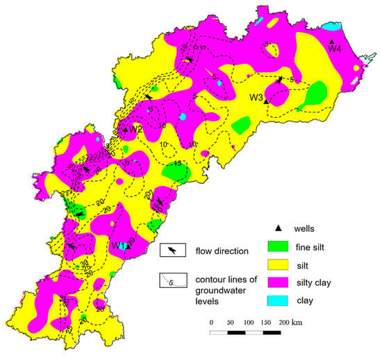 Aquifers in the Heilonggang area are mainly composed of Quaternary strata. The Quaternary aquifer system can be divided into four aquifer groups from top to bottom (Figure S1). Among them, the first aquifer group is the aquifer we focused on in this study. It is composed of Holocene and Upper Pleistocene loose sediments, with a bottom depth of 20~50 m [31]. The vadose zone lithology in this area is mainly composed of silt and silty clay (Figure 2).