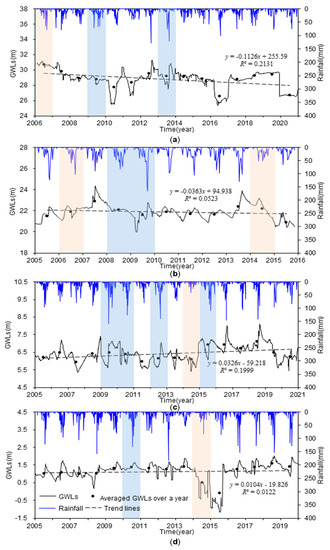 Observed time series of rainfall and GWLs at (a) W1, (b) W2, (c) W3, and (d) W4. The blue and orange bands indicate the wet year and dry year, respectively.