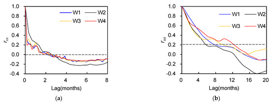 Figure 4a shows that the auto-correlation coefficients of rainfall decay quickly close to zero, and all of the correlograms become null within 3 months, implying that the rainfall is relatively random. By comparison, GWLs present a long memory effect relative to rainfall (Figure 4b). The auto-correlation functions of GWLs show that the order of increasing inertia ranks as follows: W2→W1→W3→W4. For example, the auto-correlation slope (the slope of the auto-correlation coefficient before the curve becomes flat) increases from −12.7 × 10−2 month−1 at W2 to −5.0 × 10−2 month−1 at W4 (Table 3), and the time lag required for auto-correlation coefficients to reach 0.2 (k0.2 values) also rises from W2 (5.7 months) to W4 (12.3 months). Note that without considering W2, there is an upward trend in persistence from upstream to downstream, which has also been identified by Duvert et al. [3] in a subtropical agricultural catchment dominated by alluvial aquifers in southeast Queensland, Australia.