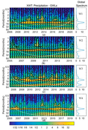 Cross wavelet spectra (left) with global wavelet spectra (right) between rainfall and GWLs at (a) W1, (b) W2, (c) W3, and (d) W4. Zones surrounded by black lines have significant wavelet power at the 95% confidence level. White lines denote the cone of influence. The phase angles are indicated by the black arrows.