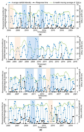 Time series of rainfall intensity, response time, and 6-month moving average of GWLs at (a) W1, (b) W2, (c) W3, and (d) W4. The blue and orange bands indicate the wet and dry years, respectively.