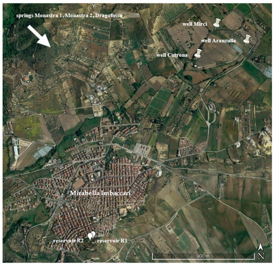 Municipality of Mirabella Imbaccari—location of springs, wells and reservoirs.