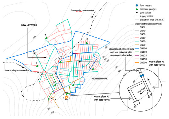 Information concerning the network characteristics (nodes elevation, length and material of the pipes) as well as the detail of the distribution of the population in the area served by the WDN were obtained from data provided by the municipality and from the results of the field surveys. The WDN has a substantial closed-loop layout with open branches that supply flows to more peripheral parts of the urbanized area. The network is characterized by high gradients in elevation with differences between the highest (reservoir R1 in the south of the town) and the lowest points served (at about 423 m a.s.l.). From the altimetry viewpoint, the WDN can be roughly divided into two portions that supply zones at different elevation: the “high zone” of the old town located in the south-east part of the municipality, and the “low zone” including areas of more recent urbanization in the north-west part of the municipality. The two zones are connected by means of a main (DN200) just downstream of the two reservoirs (see Figure 2). A servo-controlled gate valve is installed in the connection main that facilitates conveying the whole flow from the reservoirs to the high zone only, thus disconnecting the low zone of the WDN according to the operational scheduling of the intermittent supply. Primary feeder pipes of the network (including large pipes with diameters between 50 and 200 mm) are in spheroidal cast iron while the secondary feeders (corresponding to smaller diameters and capillary network) are in high-density polyethylene (HDPE). Because of the age of the system and the reduced maintenance, the WDN is characterized by relatively high values of water leakage. An estimation by the municipality based on historical data indicates average water leakage in the order of 30–40% of the flow supplied.