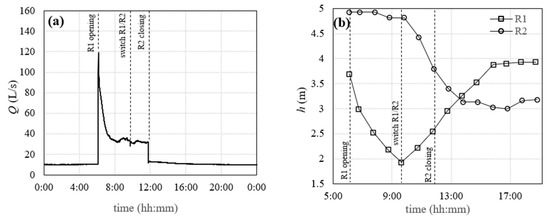(a) Outflow discharge Q from the reservoirs, and (b) water level in R1 and R2. Experiment of Sunday, 16 June 2019.