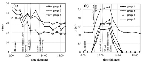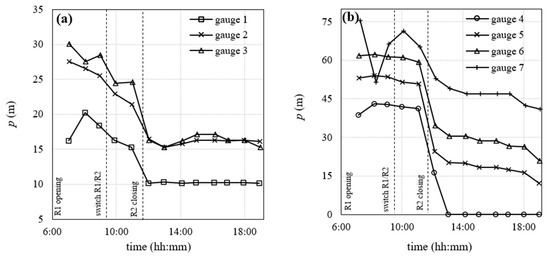 Effect of the opening of the servo-controlled valve at h 8:45 can also be observed in Figure 6a. Indeed, at that time, nodal pressures in the high zone of the network show a sudden decrease that can be ascribed to the start of the supply of the low zone of the network. Similar considerations of those set out above can be made for the other experimental days reported in Table 2.