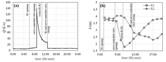 Concerning the experiments of 3 July 2019, Figure 5a shows that gate valves of reservoir R1 were opened at h 6:00 a.m. In a different way from the previous case, the supply period started with the connection between high and low zone of the network being closed. Therefore, the high zone of the network was the only part of the WDN served by the reservoir until h 8:45 a.m. The figure points out the discharge from R1 to increase gradually from about 5 L/s to about 10 L/s. Coherently, Figure 5b shows that the water level in R1 decreased from 3.9 m (value at 6:00 a.m.) to about 3.65 m (value at 08:45 a.m.). The emptying of R1 during this part of the day was slow because the water demand was limited to a relatively small part of the network with users’ tanks already full by the night flow. At the same time, the level in R2 increased because of the overflow from R1. At h 8:45 a.m., the servo-controlled valve was opened, and also, the low zone of the network was supplied; the graph of the outflow discharge shows the occurrence of a peak close to 140 L/s. As expected (Figure 5b), the slope of the curve of R1 changed with water level that dropped down to about 1.80 m in less than 2 h (from h 8:45 a.m. to h 10:35 a.m.). At h 10:35, the gate valves of R1 were closed, and those of R2 were opened. From this moment on, the water level in R2 decreased, while reservoir R1 was progressively re-filled by the inflow from the sources. Finally, at about h 12:45, the gate valves of reservoir R2 were partially closed; the connection valve between the high and the low zone of the network was simultaneously closed. The end of the supply period is identified in Figure 5a in correspondence to the time at which the outflow discharge drops down to about 7 L/s. This determined a decrease in the slope of the curve of the water level in R2 reported in Figure 5b. Close to h 5:00 p.m. the water level in R1 achieved the level of the overflow; from that time on, the water level of R1 did not change significantly, while the water level in R2 started to increase until the beginning of the supply period on the successive day.