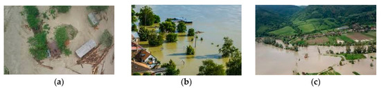 Figure 4. Floods on Siret River in 2020: (a) May 13–14; (b) June 24–25; (c) July 20–21.