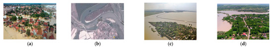 Figure 3. Floods on Siret River: (a) 2005, near Piatra Neamt; (b) 2020, after the third flood, near Ramnicu Sarat; (c) 2015, near Bacau; (d) 2020, near Focsani.