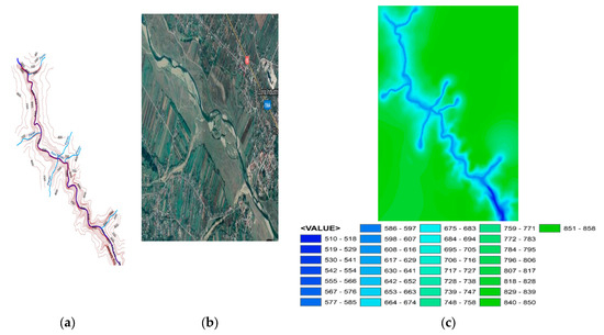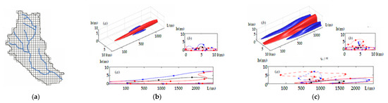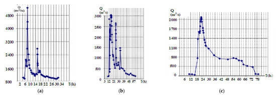 As boundary and initial conditions, the flow variation is analyzed through the flood hydrographs, Figure 4a–c and direct measurements of sediment structure. At the start, the initial conditions for the main variables must be specified for the entire domain.