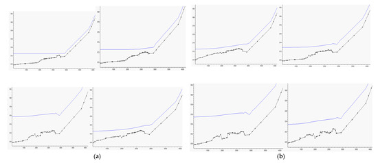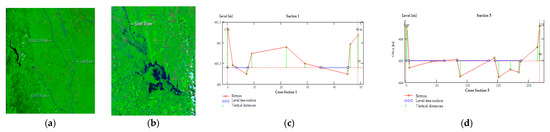 Selection of the interest area with significant cross-sections on the longitudinal profile, Figure 5a–d. Figure 5c,d represents two cross-sections from the selected area, at a low flow-rate of water, for a selected time step;
