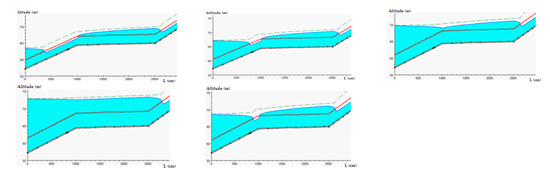 To illustrate, the flow rate transport was selected from the interesting area of five cross-sections where floods were previously recorded in large surfaces. A mass balance is achieved between the entered and transported sediments from one section to the next one. Figure 11 depicts these cross-sections during the flood, starting with the beginning of the hydrograph. The free level of water at the maximum flow rate is marked with a dark blue line; it can be seen in cross-sections where there are lateral spills.