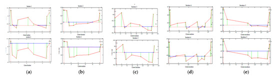 Figure 11. Cross-sections and water level at the initial and peak flow rate: (ae) sections 1–5.