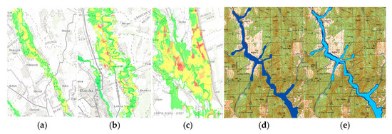 Figure 12. Numerical results for the flooded surfaces: (a) Covered surfaces after the first flood; (b) After the second flood; (c) after the third flood; (d) Covered surfaces after the third flood; (e) Comparison between the first and the third flood.