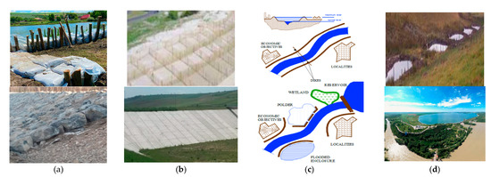 Figure 13. Management plans to transient the floods in Siret basin: (a) Temporary dams; (b) Lateral bank slopes; (c) different proposed solutions; (d) Buffer zones, reservoirs.