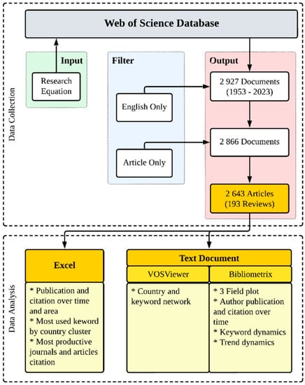 The methodology of the bibliometric analysis was based on the strategy depicted in Figure 1. Briefly, the Web of Science database was chosen once it had been broadly accepted in the scientific community as a tool for acquiring articles from several different areas of knowledge []. After that, a research equation was established to request the maximum number of papers that refer to wastes (in general) in the wine-making process, from vine management to wine bottling. The research equation then was TS = ((vine* OR wine*) AND (waste*) NOT (vinegar*)) which means that a search was completed for articles that both contain vine(s), vineyard(s), wine(s) or winery(ies), and waste(s) or wastewater(s) but not vinegar(s) written in the title, abstract, or keywords. The data timespan was 1953–2023 and was collected on 11 December 2022 and stored in excel and text format for later analysis using Excel®, VOSviewer®, and Bibliometrix® package in the R language. Finally, inside this restricted database, the bibliometric analysis was conducted to respond to the following research questions (RQ):