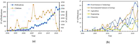 The yearly growth pattern of the most productive areas is shown in Figure 2b. Food Science & Technology is nowadays the most active one, and this can be associated with raising interest in the health benefits of value-added compounds present in wine by-products []. For instance, solid waste in winemaking is a polyphenol-rich component and can represent up to 20% w/w of grape (dry basis) []. The combination of these two factors increased the number of publications in this area with the development of new food products such as cookies [], functional muffins [], fortified yoghurt [], and flour []. However, there is still a lack of literature considering the risks associated with the daily intake of these products, health safety, and legislation. Grape pomace was identified as a potential ingredient for the human diet while highlighting the importance of arsenic level control on these products, as they observed a high level of this heavy metal in their samples [].