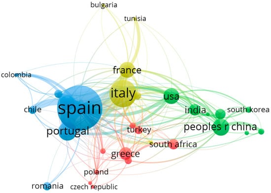 In Figure 3, the co-authorship network is shown considering the 57 contributing countries. Among these countries, the top ten most productive (Publications/Citations) were: Spain (618/16987), Italy (318/9735), Portugal (196/4507), China (174/4365), France (156/4293), USA (155/5165), Brazil (142/4379), Greece (118/3997), India (105/3103), and Australia (94/2886). The Cluster Analysis demonstrates how countries collaborate internationally, allocating countries that collaborate closely and in the same cluster, while link strength is related to the intensity of collaboration. There are 4 clusters in Figure 3 (marked with different colors: Spain, Italy, Greece, and the USA), where a great knowledge exchange can be observed. The most productive continents are Europe, the Americas, and Asia, while Spain stands out among the countries with the most significant contribution to this topic.
