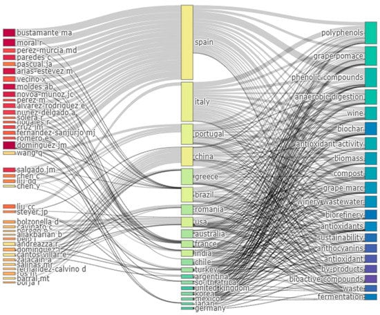 Figure 4 is a three-field plot where the most productive authors—countries—keywords are plotted. Most productive authors are affiliated with Spain, which is followed by China, the USA, Portugal, and Italy. On the other hand, countries are interested in a very wide range of topics, with a higher tendency for most used keywords such as “polyphenols”, “grape pomace”, phenolic compounds”, “anaerobic digestion”, “wine”, “biochar”, and “antioxidant activity”.