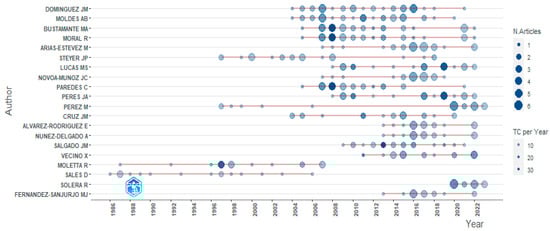 The productivity in terms of publications and citations over time of the most prominent authors in the literature is represented in Figure 5. This plot reveals that many authors began to develop work on that topic by 2004, although one of them started earlier, in 1997. The most productive author (Dominguez JM) has extensively studied strategies for the valorization of vine trimming shoots, while other topics have been addressed, such as the production of ferulic acid esterases [], biogas [], vanillin, vanillyl alcohol, and vanillic acid [], and biosurfactants []. The second and third most productive authors (Bustamente MA and Moral R, respectively) worked with biodegradation and sludge management strategies [,]. The first to publish on that topic currently works with the production of biogas [], bio-hydrogen [], and eco-friendly ways of valorizing winery wastewater []. The newest author to address that topic (Solera R.) has been working on anaerobic co-digestion strategies [], performing techno-economic analysis [], and modeling bioreactors [].