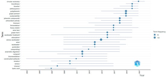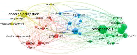Solid residues are mainly associated with biochar, pyrolysis, and composting, which are strategies for the management of grape marc, pomace, shoots, and wine lees after further valorization through the extraction of value-added compounds, for example. On the right side of Figure 6, there is the polyphenols cluster highly associated with grape, grape pomace, phenolic compounds, antioxidant, antioxidant activity, anthocyanins, extraction, and optimization techniques. It is noticeable the distance between this emergent cluster and the well-established wine industry’s traditional waste and waste treatment strategies. Finally, the “circular economy” and “biorefinery” keyword clusters emerge as knowledge transfer agents. The circular economy is an emerging concept on that topic that represents the transition from a linear economy to a renewable and sustainable approach to wine production. This implies smarter use of bioresources to minimize waste generation and recirculate as many by-products as possible to minimize net-carbon emissions []. Biorefinery, on the other hand, is a specific topic for the development of innovative solutions to further process waste to produce new products with aggregated value (e.g., food, animal food, biofertilizer, biopesticide, biocosmetics, biopolymers, biofuels) []. The aim of biorefinery inserted in a circular economy-based society is to make the world independent of fossil fuels by making use of renewable bioresources only. Both concepts connect traditional wine industry waste management techniques with new trends in the market for the recovery of added value compounds in a biorefinery approach towards a circular economy through innovation, making use of life cycle assessment tools to achieve sustainable development goals.