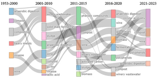 Keyword thematic evolution is also an important tool to assess trends over time and for informed decision-making in research. There is a traditional core in winery waste treatment over time, which is shown in Figure 7. This core is represented by “anaerobic digestion”, which has always been studied and recently integrated into anaerobic co-digestion, as discussed before in this work. Composting is another intergenerational applied technology. Nowadays, there is still great interest in studying these technologies that are described in other works, such as winery wastewater treatment [] and integrated anaerobic treatment and composting in a biorefinery approach [].