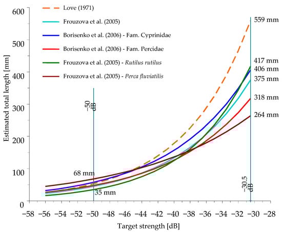 - Frouzová, J.; Kubečka, J.; Balk, H.; Frouz, J. Target strength of some European fish species and its dependence on fish body parameters. Fish. Res. 2005, 75, 86–96. [Google Scholar] [CrossRef]
