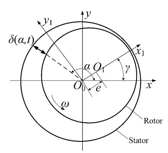 where δ0 is the average length of the air gap when the rotor is not eccentric, α is the angle at the eccentric position, γ is the angle of rotation of the generator rotor, and e is the radial displacement of the generator rotor axis (i.e., rotor eccentricity distance).