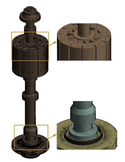 Figure 3 shows the three-dimensional structural mesh model of the rotor system of the pumped storage unit. The structure of the rotor system is complex. A structured mesh is used for the circumferentially distributed structure in the rotor system, and an unstructured mesh is used for the non-peripherally distributed structure, and the mesh is encrypted and adjusted for the small structural surfaces in the rotor system in order to ensure the quality of the mesh and the accuracy of the mesh node connections in the area of structural dimensional changes and localities.