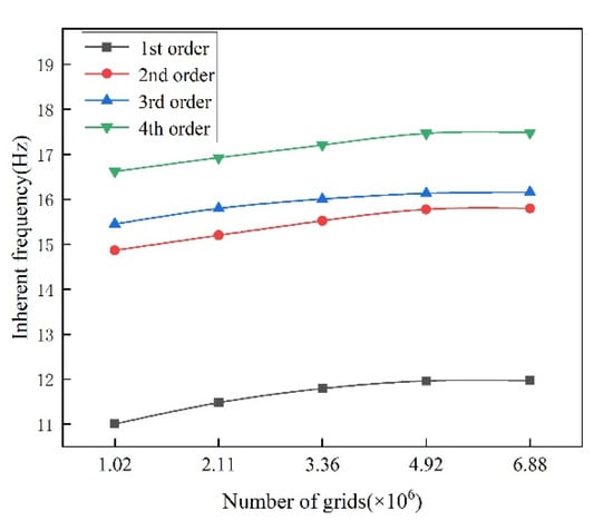 In order to ensure the accuracy of the numerical calculation results and to save computer resources [], this article takes the calculated value of the inherent frequency of the rotor system modal analysis as the target, and verifies that the change rate of the first three orders of the inherent frequency of the modal of the rotor system is less than 3% for different numbers of rotor system grid models, and finally chooses a rotor system calculation model with a grid number of 4.92 × 106. The grid-independent verification results are shown in Figure 4.