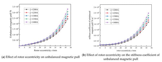 Figure 5b shows the effect of rotor eccentricity on the unbalanced magnetic pull stiffness coefficient of the generator rotor in a pumped storage power station. The larger the rotor eccentricity, the more obvious the non-linear increase in the unbalance magnetic pull stiffness coefficient. When e < 15 mm, the unbalanced magnetic pull stiffness coefficient mainly increases gradually in a linear trend, with a small increase, and the excitation current has less influence on the increase in the unbalanced magnetic pull stiffness coefficient. When e >15 mm, the unbalanced magnetic pull stiffness coefficient mainly increases gradually in a non-linear trend, with a larger increase, and the rotor eccentricity has a greater influence on the unbalanced magnetic pull stiffness coefficient. When e = 3 mm, the increase in the unbalanced magnetic pull stiffness coefficient of the rotor from 1200 A to 1400 A is 4.35 × 106, and when e = 47 mm, the increase in the unbalanced magnetic pull stiffness coefficient of the rotor from 1200 A to 1400 A is 6.35 × 107. The increase in the unbalanced magnetic pull stiffness coefficient of the two rotor eccentric distances reaches 14.54.