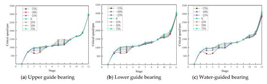 The effect of changes in the upper guide bearing, lower guide bearing, and water guide bearing stiffness coefficients on the critical speed of the system is shown in Figure 6. In order to study the influence of the guide bearing stiffness on the critical speed of the unit’s shaft system, the axial and torsional stiffnesses of the thrust bearing were first determined to be 2.5 × 109 N/m and 2 × 1010 N·m/r, respectively, and the critical speeds of the shaft system were calculated when the upper, lower, and water guide bearing stiffnesses were fixed at 2.0 × 109 N/m, 2.0 × 109 N/m, and 1.5 × 109 N/m, respectively, and then the critical speeds of the shaft system were then calculated when the individual bearing stiffness is increased or decreased by 25%, 50%, and 75%, respectively, to obtain the effect of the change in bearing stiffness on the critical speed of the unit’s shaft system.