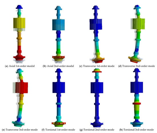 The modal vibration pattern of a rotor system reflects the ratio of the relative displacements of the degrees of freedom of the structure at each order of the modal state. In this study, a rotor system modal shape considering unbalanced magnetic tension (magnetic tension stiffness factor of −2 × 108 N/m) was selected for analysis. Figure 7 shows the low-order modal vibration pattern of the rotor system; the transparent area is the undeformed model of the rotor system, and the colored area is the deformed model of the rotor system. The axial first-order modal vibration model shows the overall rigid up and down movement of the rotor system, while the second-order modal vibration model shows the axial expansion and contraction movement of the generator rotor and turbine runner, and the displacement amplitude of the runner is larger. The transverse first-order mode is mainly characterized by the transverse oscillation of the runner, with the largest displacement values occurring in the runner structure and the generator rotor being almost stationary. The second- and third-order modes are characterized by the reverse oscillation of the runner and generator rotor, with the largest second-order-mode displacement values occurring in the runner structure and the largest third-order-mode displacement values occurring in the generator rotor structure. The torsional first-, second-, and third-order modal oscillations are manifested by the torsion of the pump turbine runner, the torsion of the generator rotor, and the torsion of the coupling below the main shaft guide bearing, with the oscillations becoming larger or smaller in the radial direction.