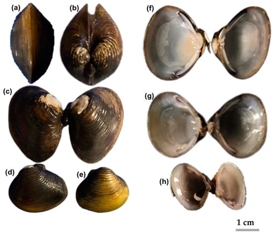 Samples of the Corbicula fluminea catch from September 2021, February 2022, and May 2022 found in the IGEPA Igarapé Gelado—in the province mineral of Carajás, Brazil; (a) external view of a closed specimen; (b) external view of a closed specimen; (c–e) external view of opened specimens in different sizes; (f–h) internal view of opened specimens in different sizes.