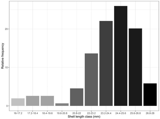 A total of 154 specimens of C. fluminea were collected, 19 in September 2021, 34 in February, and 101 in May 2022 (Figure 2). The size range of the specimens was 2.8 to 1.6 cm in shell length and 5.91 to 1.46 g in wet weight Figure 3).