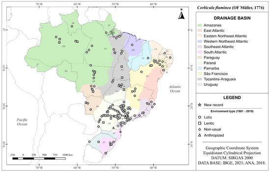 In general, the main vector of dispersion of this species in most of the sites recorded is ballast water, both from vessels that circulate the high seas and from cabotage ships that ballast and de-ballast in small ports along the Brazilian coast. The vessels that transport containers between countries can bring a lot of specimens through the bioencrustation process, but even though these vessels do not arrive in the IGEPA, the specimens of C. fluminea can easily access these ecosystems. In addition, if we consider continental waterways, both adult individuals and post-larvae can be transported inside cisterns or in the sand for construction and removal from contaminated water sources to other areas [16,27,28,29,30,31,32,33,34], which may have contributed to the invasion of this species in IGEPA. In studies conducted by Leal et al. [15] in watersheds in Brazil, occurrence records were found in 22 states and the Federal District (Figure 4).