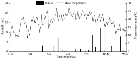 The experiment was conducted in Minghua Township Test Station (38°40′ N, 98°4′ E, altitude 1368 m), Sunan Yugu Autonomous County, Zhangye, Gansu Province, China, from April to October 2020. The average annual precipitation, evaporation, temperature, frost-free period, and sunshine hours of the test site are 90 mm, 1731 mm, 7.3 °C, 131 d, and 3034 h. The soil properties are shown in Table 1. The meteorological data (Figure 1) was measured by a small intelligent agrometeorological station (Tianqi WSTQ). The precipitation during the growth period of herbage was 51.4 mm, and the average temperature was 20.6 °C.