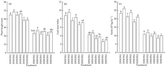 Effects of water and nitrogen regulation on plant height, leaf area index, and yield of forage. D1 and D2 refers to mixed-sowing and mono-sowing, respectively. W1, W2, and W3 refers to slight water deficit, moderate water deficit, and serious water deficit, respectively. N1 and N2 refers to nitrogen application rates of 60 kg·ha−1and 120 kg·ha−1, respectively. Different lowercase letters indicate significant difference among treatments (p < 0.05). (a), (b), and (c) refers to plant height, leaf area index, and yield, respectively.