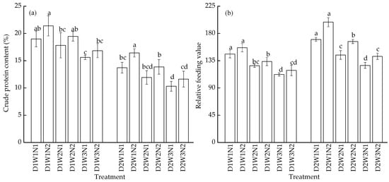 Effects of water and nitrogen regulation on crude protein content and relative feeding value of forage. D1 and D2 refers to mixed-sowing and mono-sowing, respectively. W1, W2, and W3 refers to slight water deficit, moderate water deficit, and serious water deficit, respectively. N1 and N2 refers to nitrogen application rates of 60 kg·ha−1and 120 kg·ha−1, respectively. Different lowercase letters indicate significant difference among treatments (p < 0.05). (a) and (b) refers to crude protein content and relative feeding value, respectively.