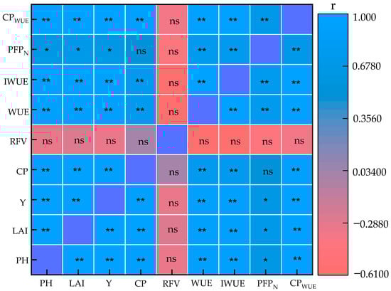 Matrix of correlation coefficients among the indicators of forage under different water and nitrogen regulations. r indicates correlation coefficients. ** indicates an extremely significant difference (p < 0.01); * indicates a significant difference (p < 0.05); ns indicates no significant difference (p > 0.05).