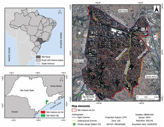 São Caetano do Sul is located in the southern São Paulo metropolitan area and belongs to an important industrial region in Brazil, named ABCD Region (Figure 1). The study site was chosen due to its history of floods (Table 1). The municipality is intensely conurbated with the municipalities of São Paulo, Santo André, and São Bernardo do Campo, with visually undefined limits among them. According to the Brazilian Institute of Geography and Statistics (IBGE), the current population of São Caetano do Sul is estimated at about 162,763 inhabitants in an area of 15.33 km2 []. São Caetano do Sul is the second city with the highest economic density [] in the country and, according to the UN Sustainable Development Goals, the municipality occupies 1st place within the ranking of sustainable cities in Brazil [].