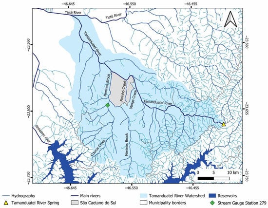 São Caetano do Sul is located downstream in the Tamanduateí River Watershed (Figure 2), a densely urbanized sub-basin of the Tietê Upstream River (Alto Tietê in Portuguese) Watershed. The Tamanduateí Watershed has a drainage area of 330.41 km2, which totally encompasses the city of São Caetano do Sul and partially the cities of Diadema, Mauá, Santo André, São Bernardo do Campo, and São Paulo. Its main river, Tamanduateí River, is 36.5 km long. Tamanduateí River rises in Mauá and flows into Tietê River by a narrow-rectified channel. The Tamanduateí River Watershed is divided into four sub-basins: Tamanduateí Inferior, which includes the city of São Paulo; Meninos Downstream and Couros; Tamanduateí Upstream and Meninos; and Tamanduateí Upstream and Oratorio, where its spring is located [].